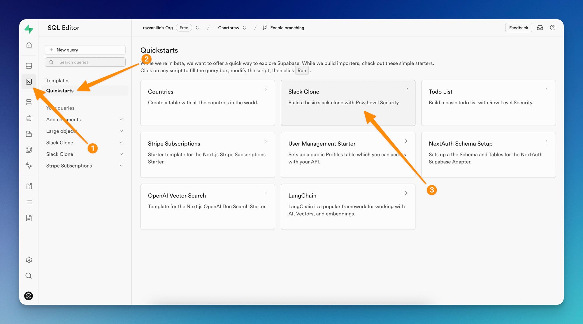 You can start by creating an account at supabase.com and once your database is fully set up, you can use a Quickstart database to create some initial tables. Head over to the SQL Editor menu, then tap on Quickstarts, and finally, choose the Slack Clone template to run and set up the initial database tables.