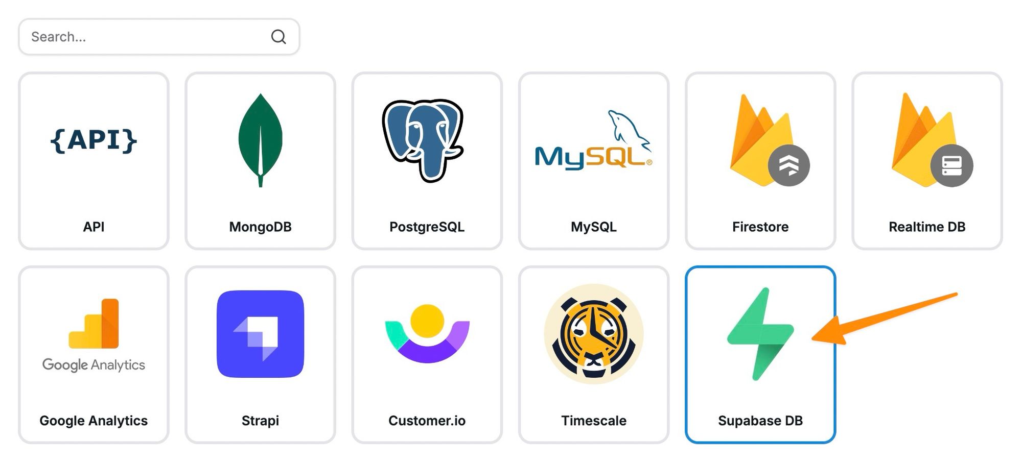 Now that Supabase is all set up with a read-only user, we can create a new connection in Chartbrew. Head to the new connection screen and select Supabase DB from the list.