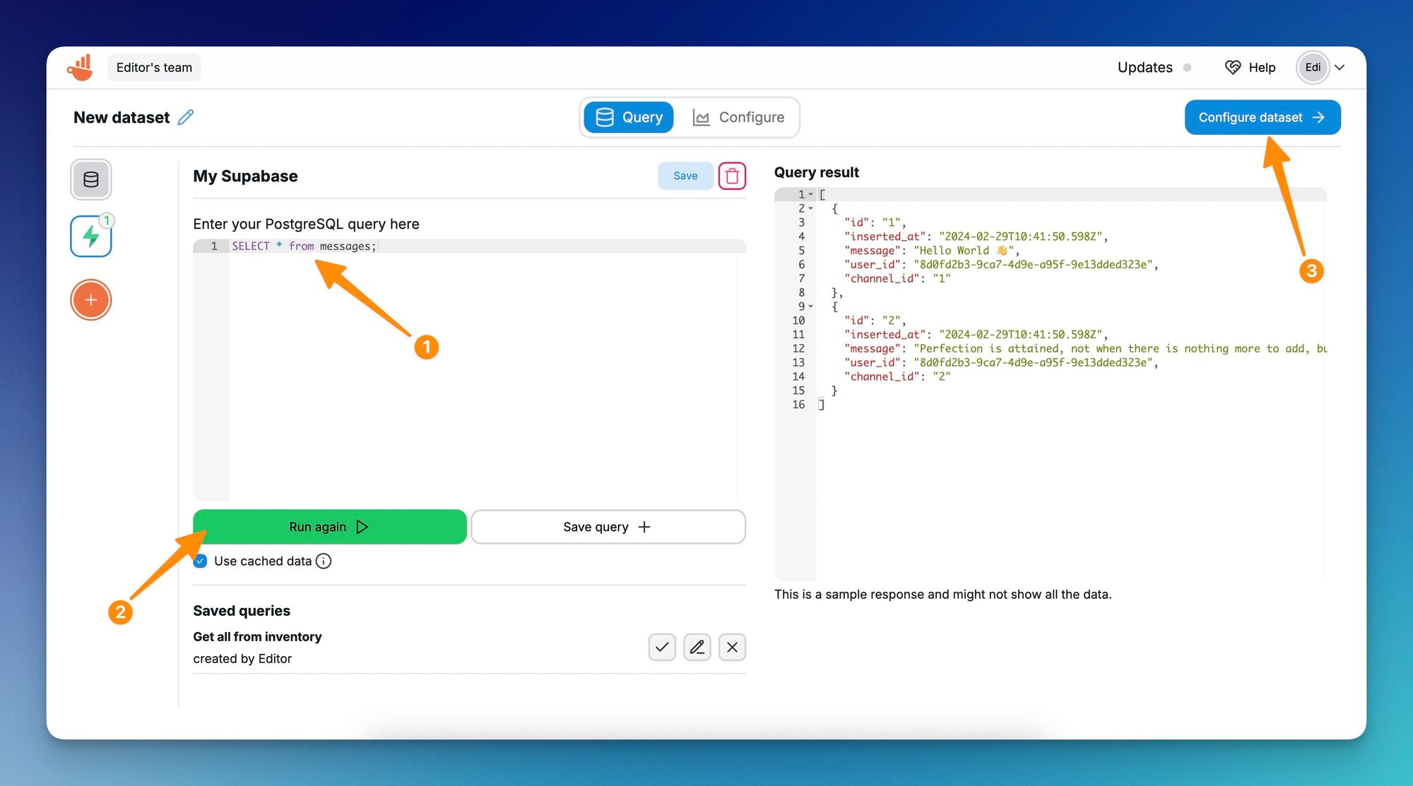 The next screen will prompt for a SQL query to fetch the data from the Supabase. The quickstart database from Supabase has a messages table seeded with a bit of data so let's try to query that one.