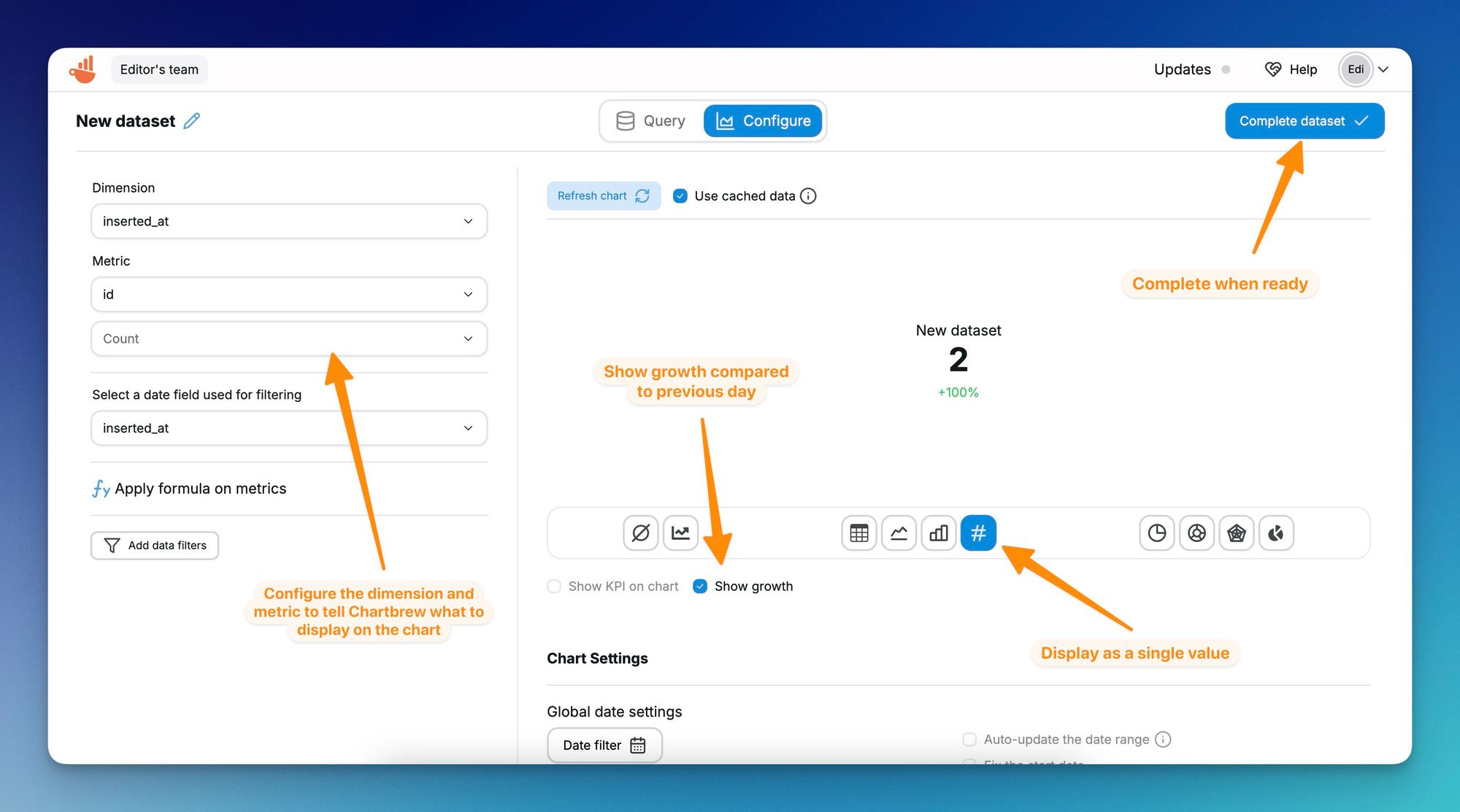 And that's it! You can create as many charts as you want now and separate them in different dashboards, set them to keep your data updated and much more!