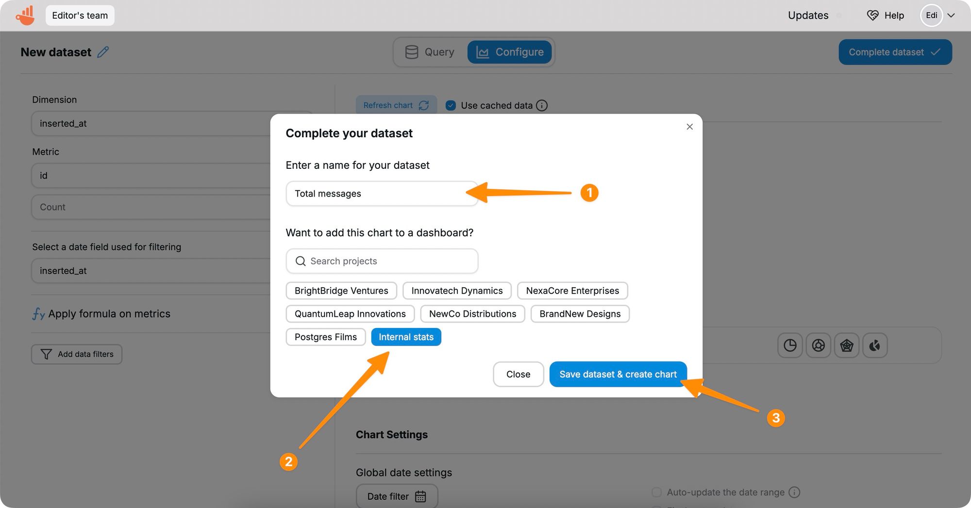 When completing the dataset, you have the option to create a new chart with the last configuration and place it in one of your dashboards. Alternatively, you can just save the dataset and create the chart later. In this instance, we are going to add the KPI in one of our projects to see how it looks next to the others.
