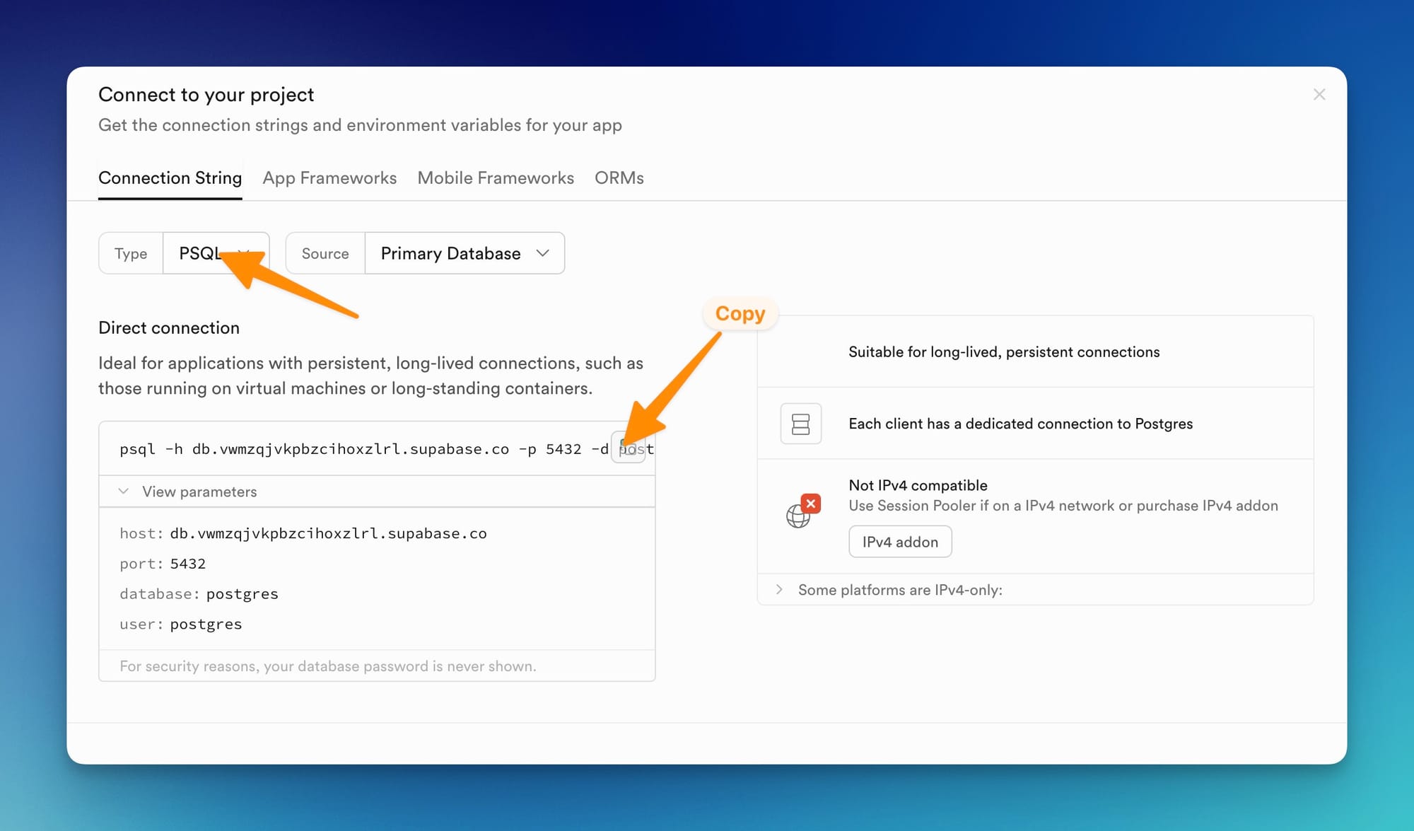 To connect to Supabase's database, we first need the psql command which is available in the Project Settings menu in your Supabase dashboard.