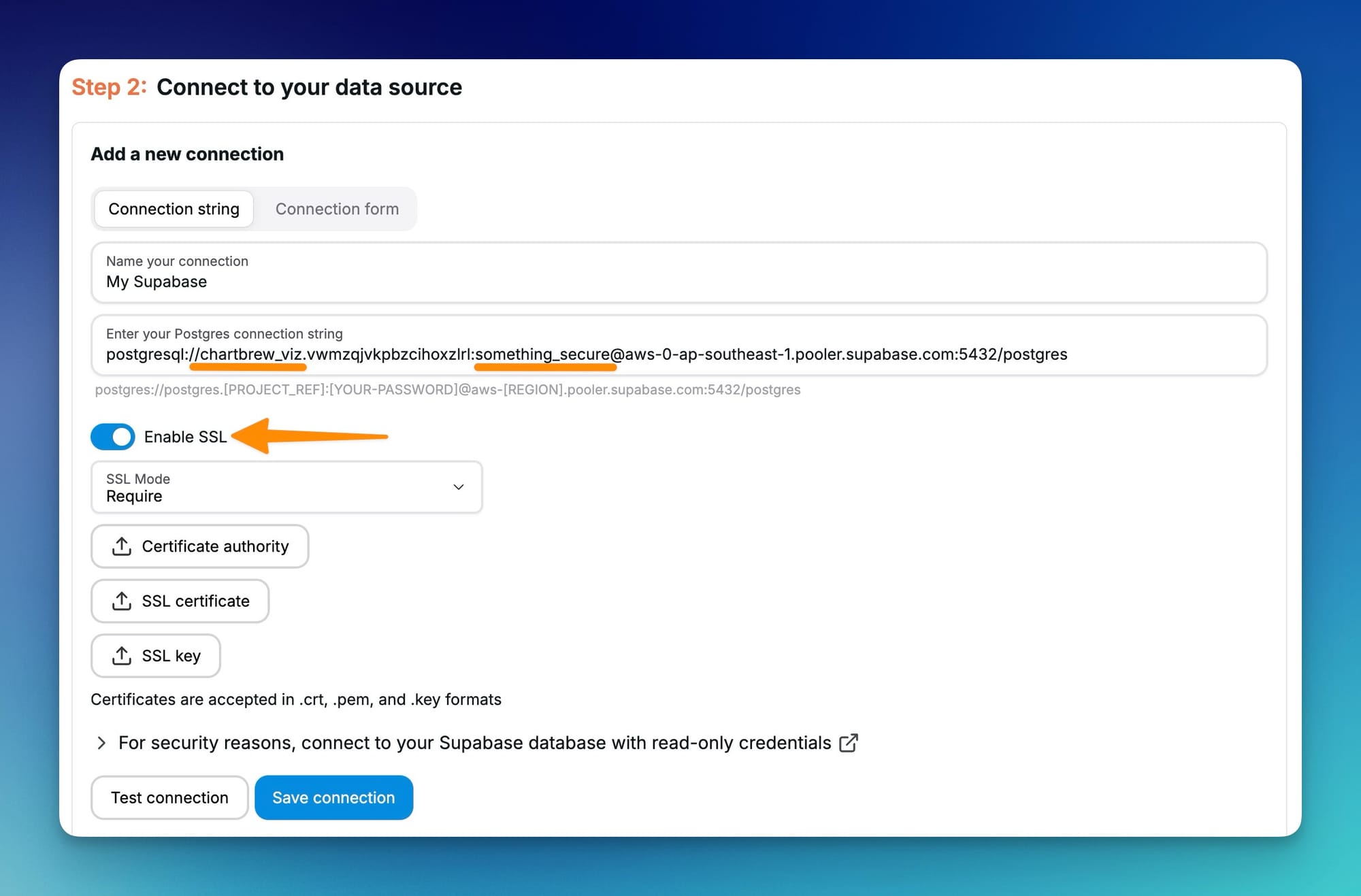Copy the URI string to Chartbrew, replace the username (postgres) with chartbrew_viz and the password you set during the user creation process in psql. Depending on your SSL configuration, you might need to enable SSL mode and add your certificate to Chartbrew. Finally, test the connection, and if it works press the Save button.