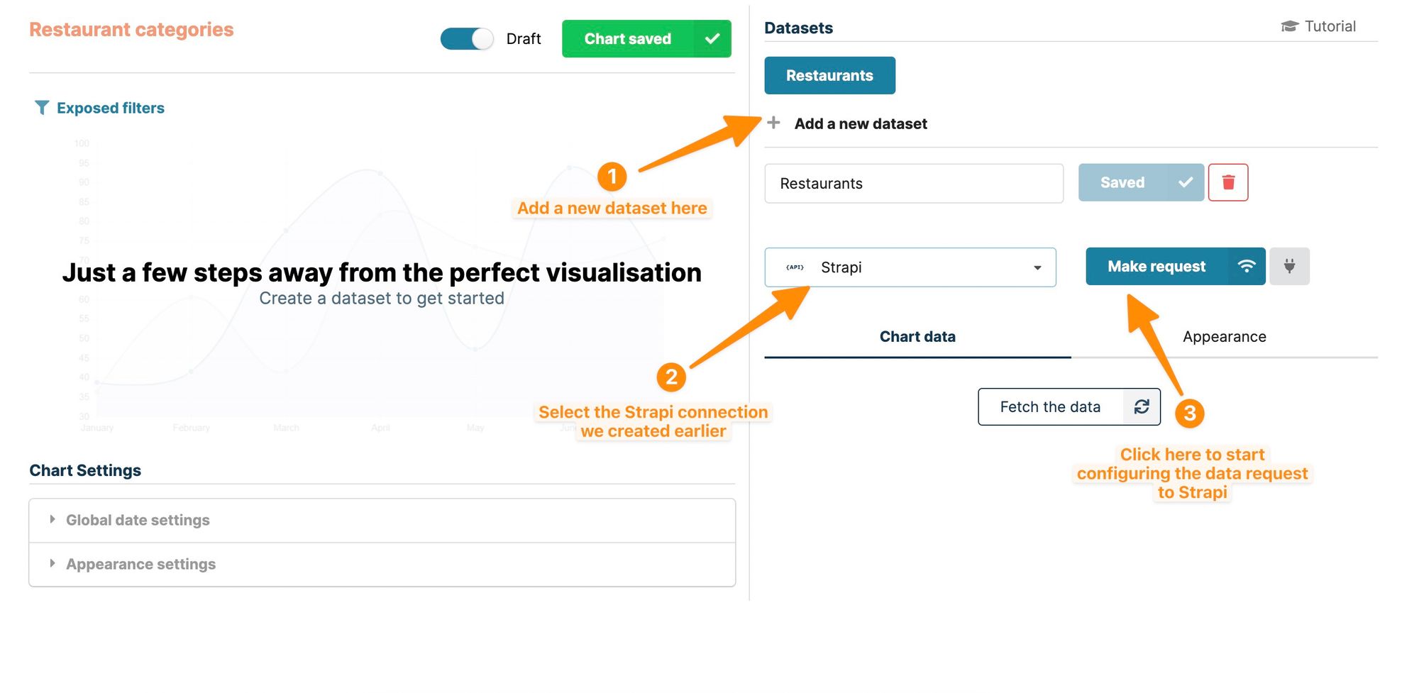 To start connecting the chart to the Strapi API, we have to create the first dataset, change the name if you wish, then click on the Get data button to connect the dataset to our Strapi connection.