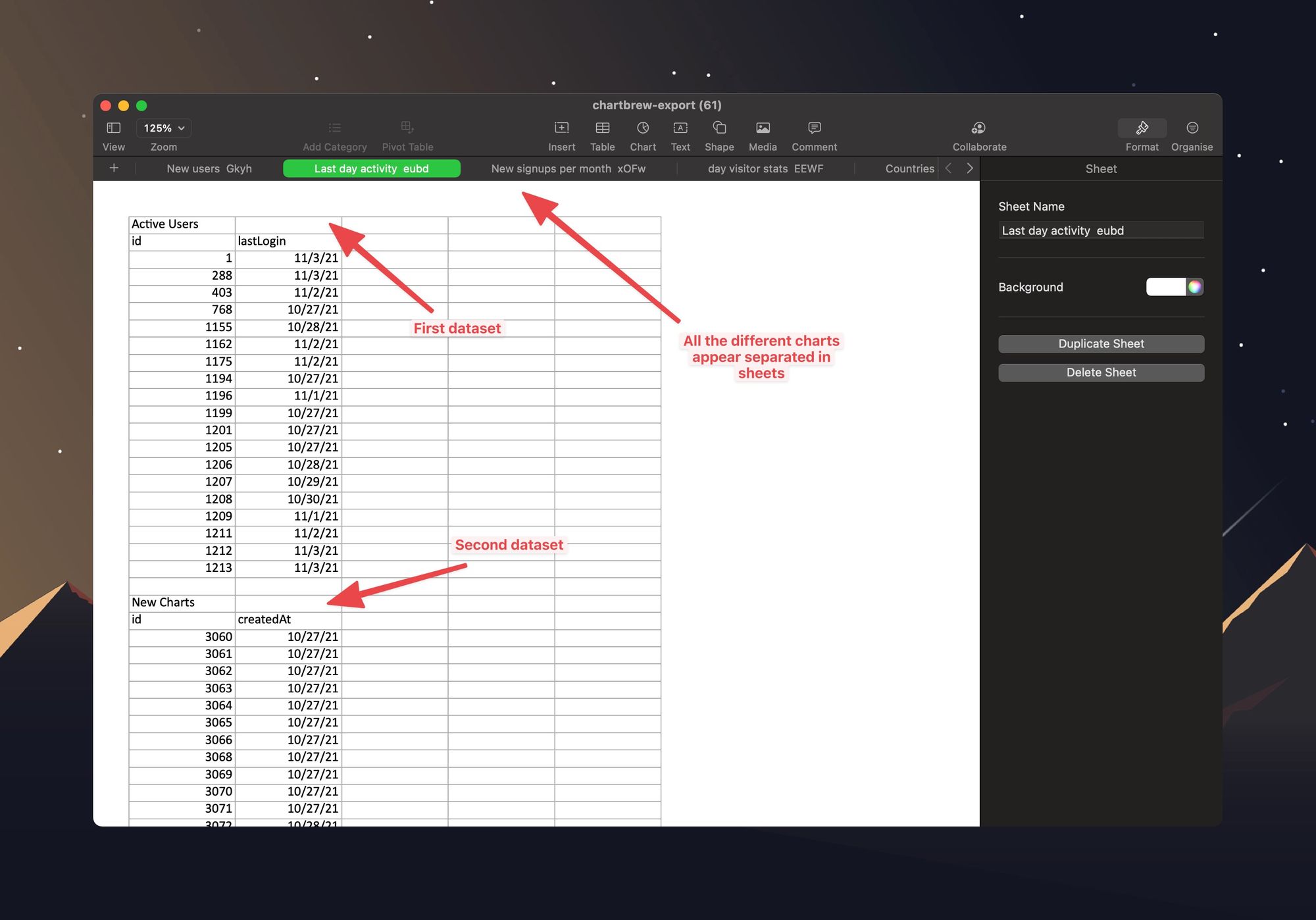 The exported file will have all the chart data you selected in the modal. Take a look below at how the export looks like and how it's structured: