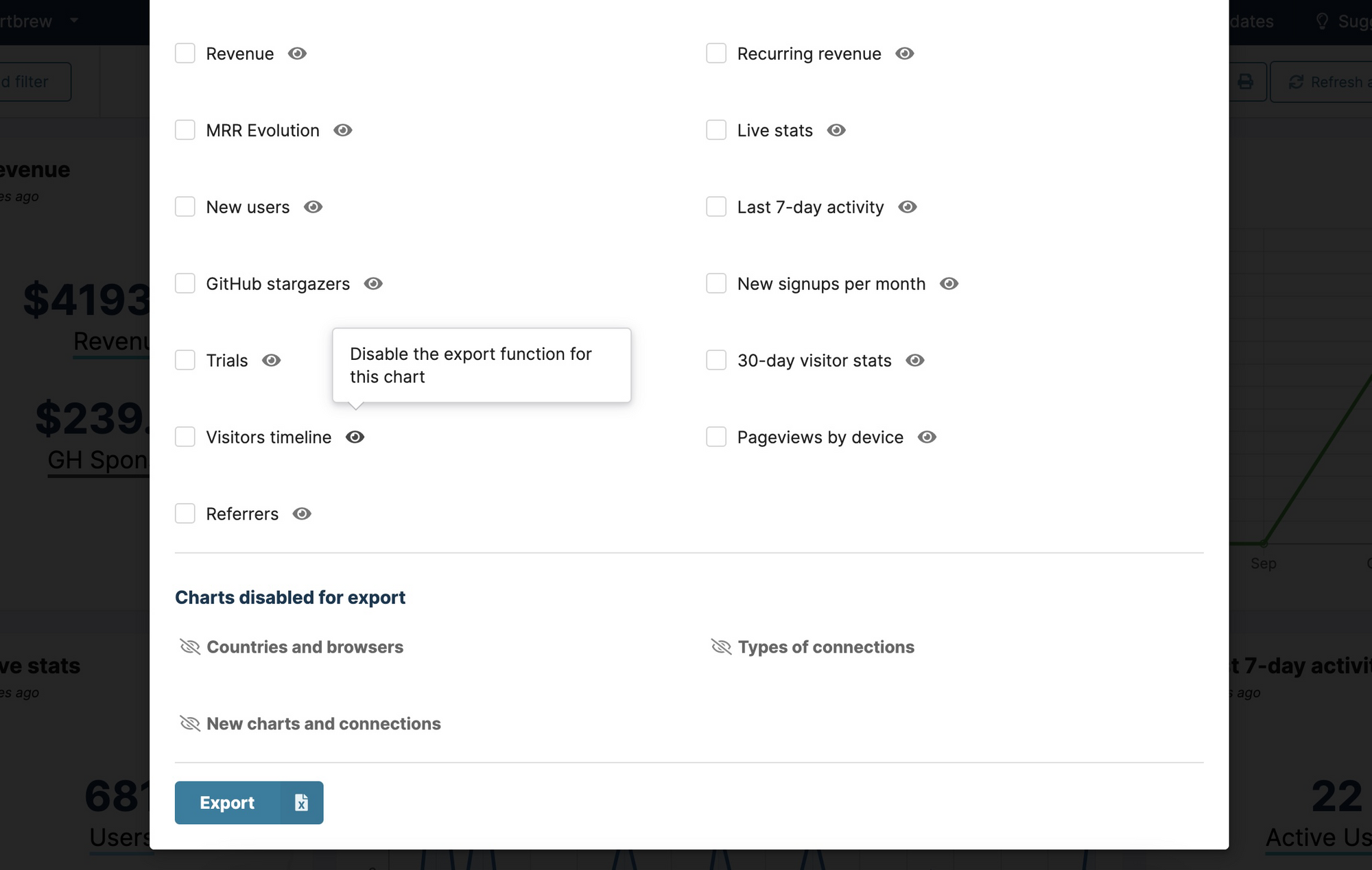 Another extra feature available in Chartbrew is to hide charts from the dashboard export. It is useful when you export dashboards often, but don't want to export some of the charts. The dashboards admins can hide these dashboards from the export screen by clicking on the "eye" icon like shown in the screenshot below: