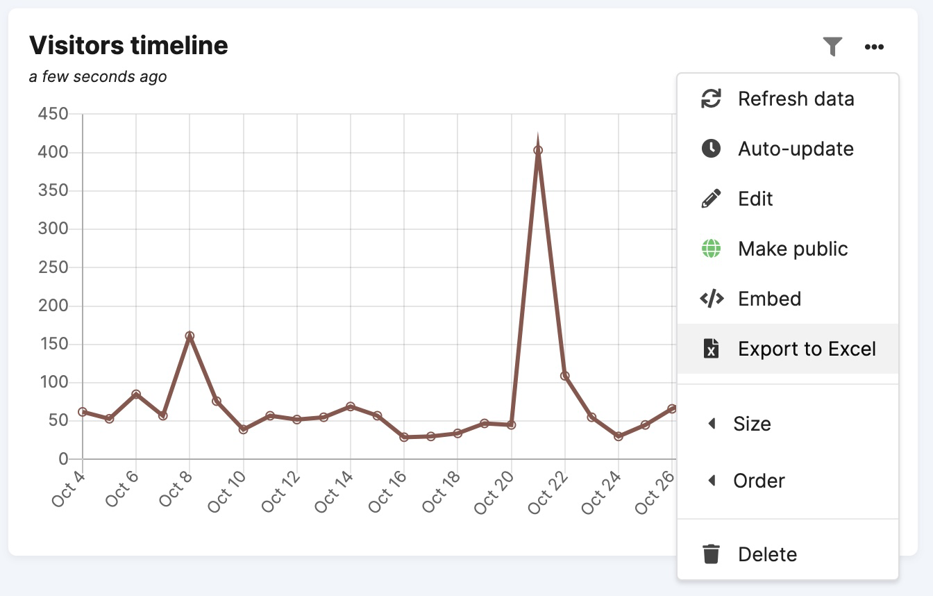 To start the export, you can head over to any of your dashboards, open the chart settings and select "Export to Excel" from the list.