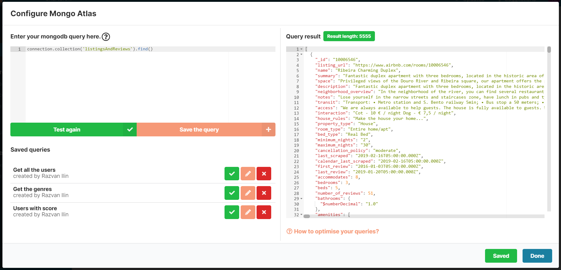 Similar to MySQL and PostgreSQL, Chartbrew allows you to write queries to fetch the data and then export the data from your dashboard.