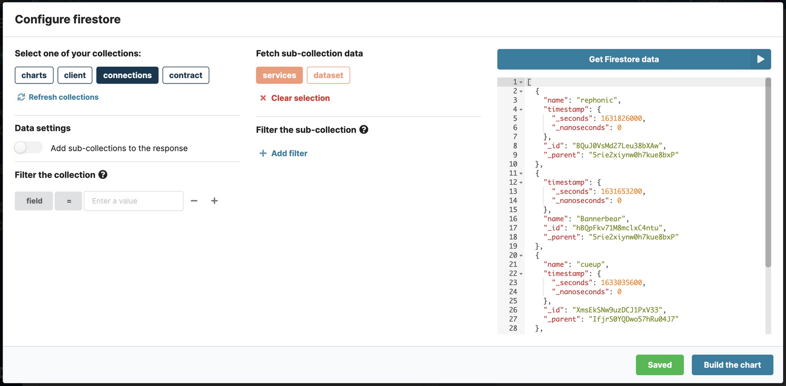 Chartbrew features a no-code UI for fetching the data. You can browse your collections and sub-collection, as well as filter the data. Using this data, you can then create a chart and export the data to Excel as in the other examples.