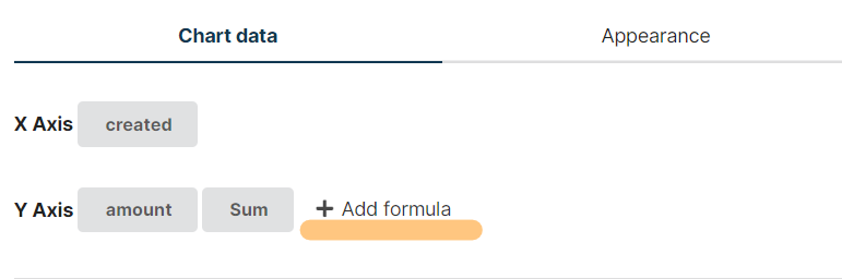 Stripe's amount data is represented in cents and we rarely need such a value. The value in the screenshot above is in cents as well, so let's format that to show full dollars (or any other currency you have in your Stripe account). Click on the Add a formula link next to the Y-Axis configuration like so: