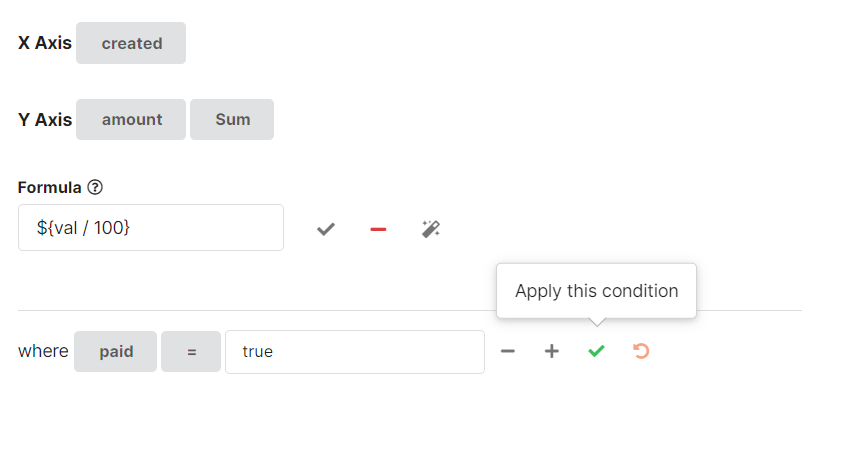As an extra, you might want to see only the revenue coming from completed payments. Chartbrew allows us to filter any kind of data and in the case of the Stripe charges, we need to check if the charge has been paid.