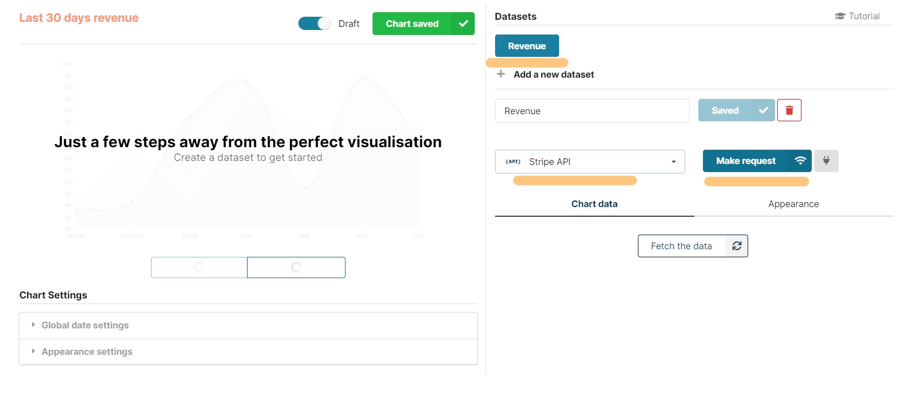 Click on the Create a chart button in the side menu, enter a descriptive name for it, and then we will get to the chart configuration page. Here, we need to first create a Dataset from the right side of the page and we will call it Revenue.