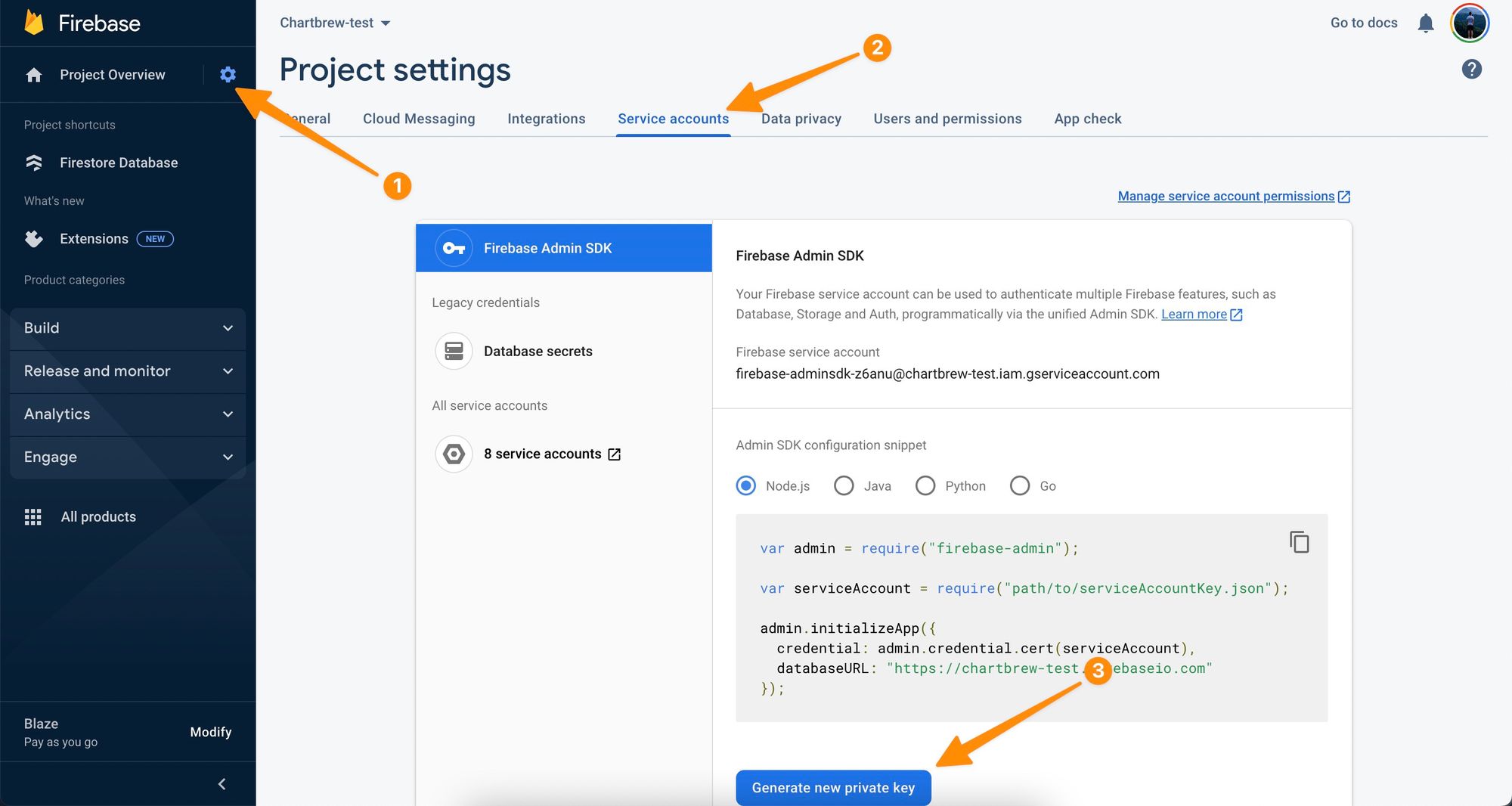 To authenticate, we need a service account key that can be generated from your firebase dashboard. Here is how you can get yours: