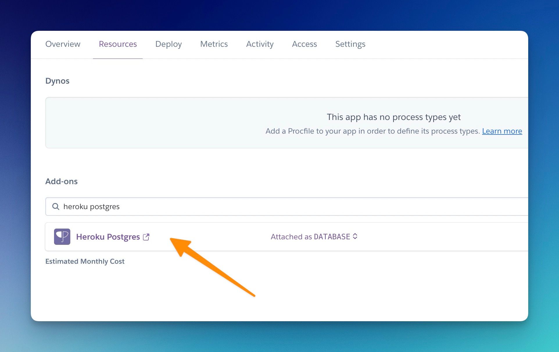 The database we are going to connect to is hosted on Heroku and it can be attached as an add-on to your Heroku application.