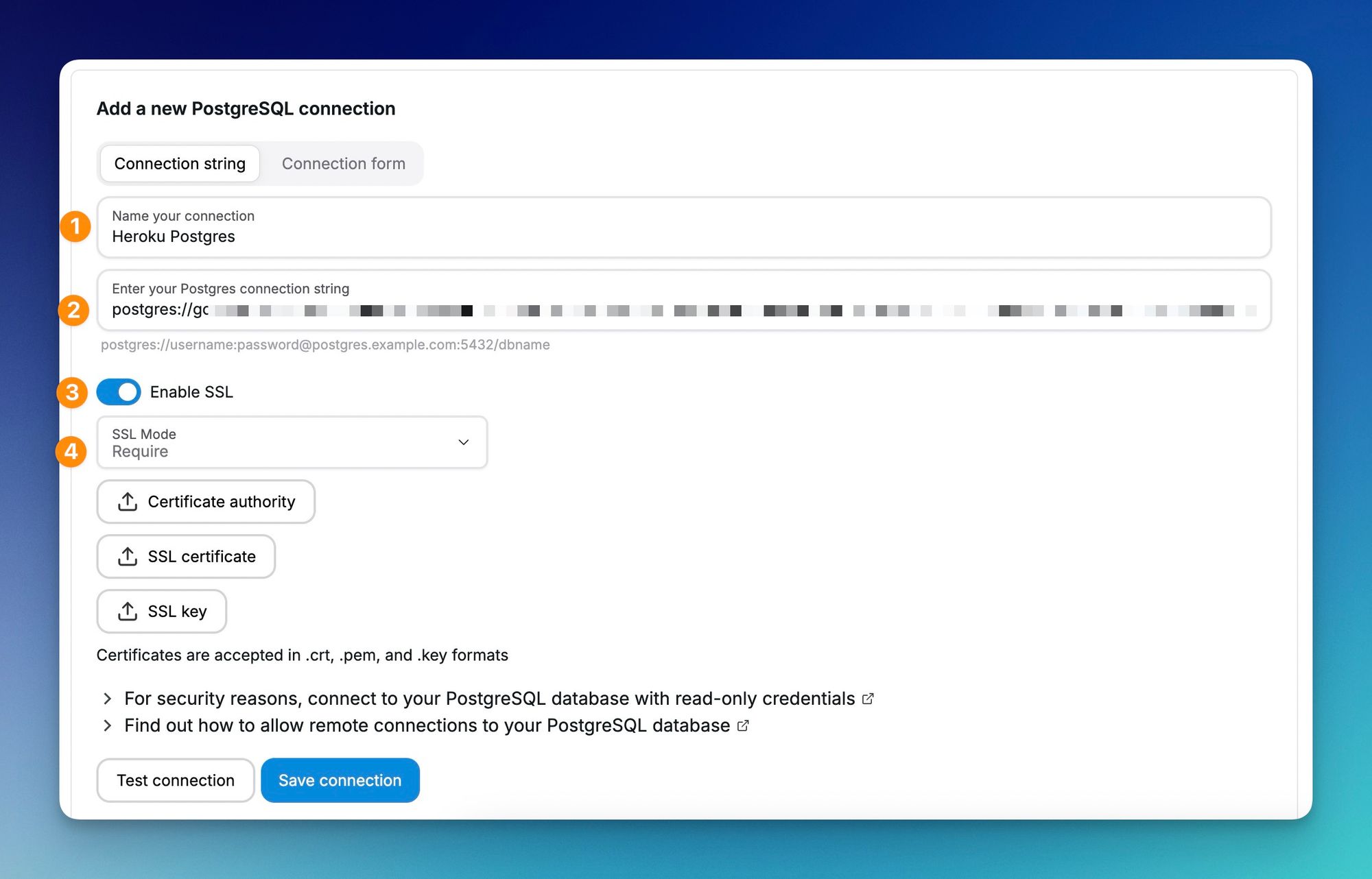 Next up, we will need to get the Postgres database credentials from Heroku. If you use a production database, it is recommended to connect with a read-only user. You can find out more about how to manage credentials on Heroku in the link below: