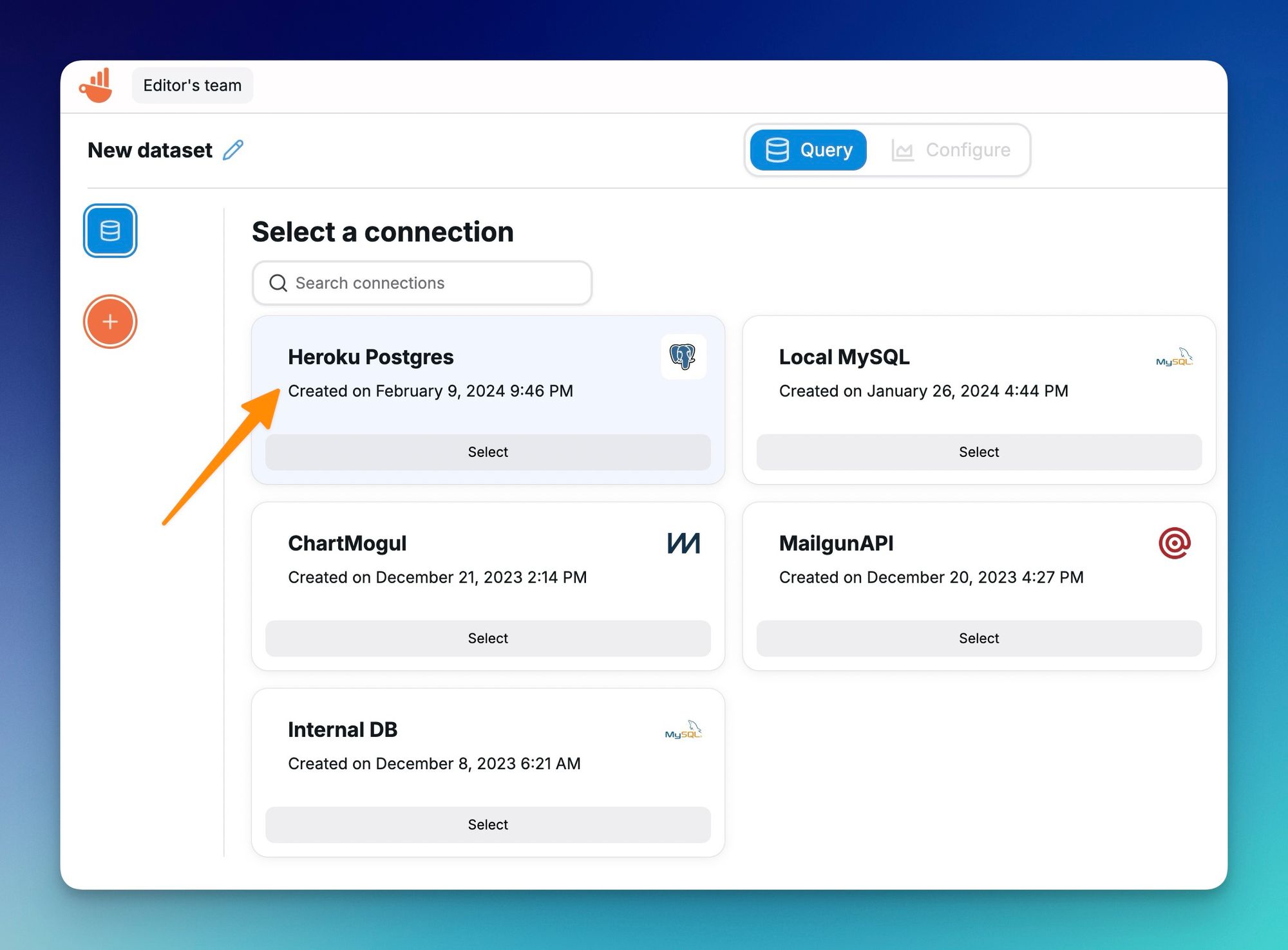 When you create a new dataset, Charbrew will ask which connection to use to fetch the data. Let's select our new Heroku Postgres connection and create our first dataset.