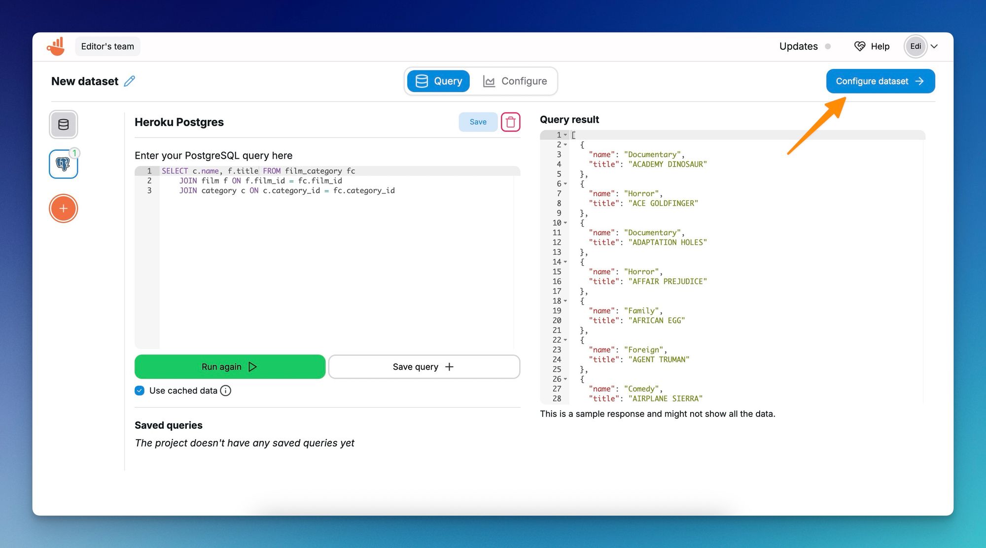 When making a SQL query, Chartbrew shows a preview of the data in JSON format on the right side of the screen. The results are limited to only a few results in the preview to keep the application snappy. Once you are happy with the results, click on the Configure dataset button to head over to previewing visualizations.