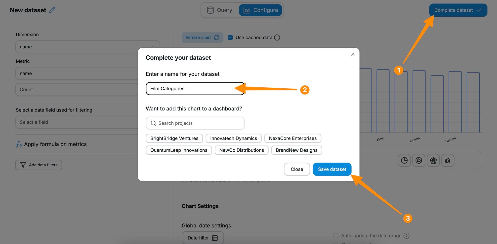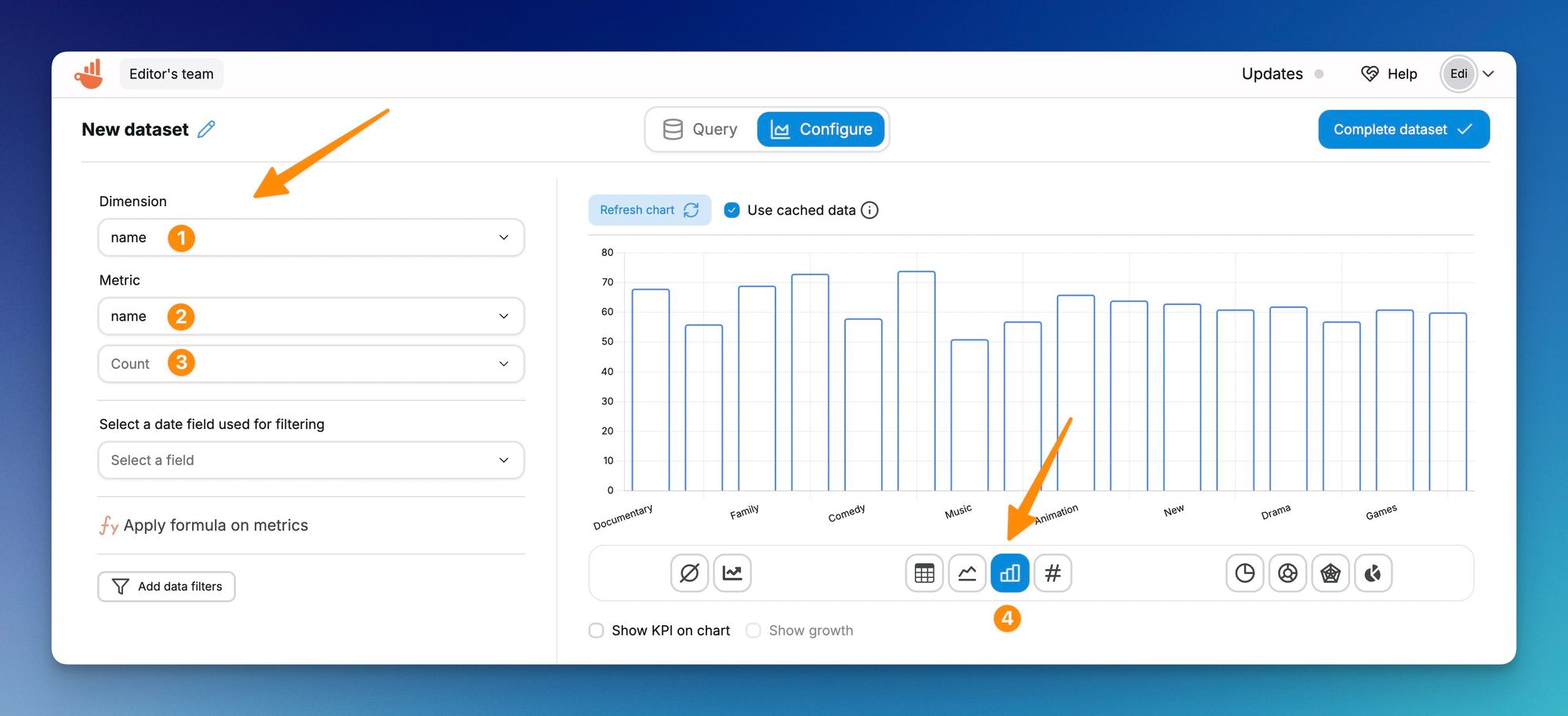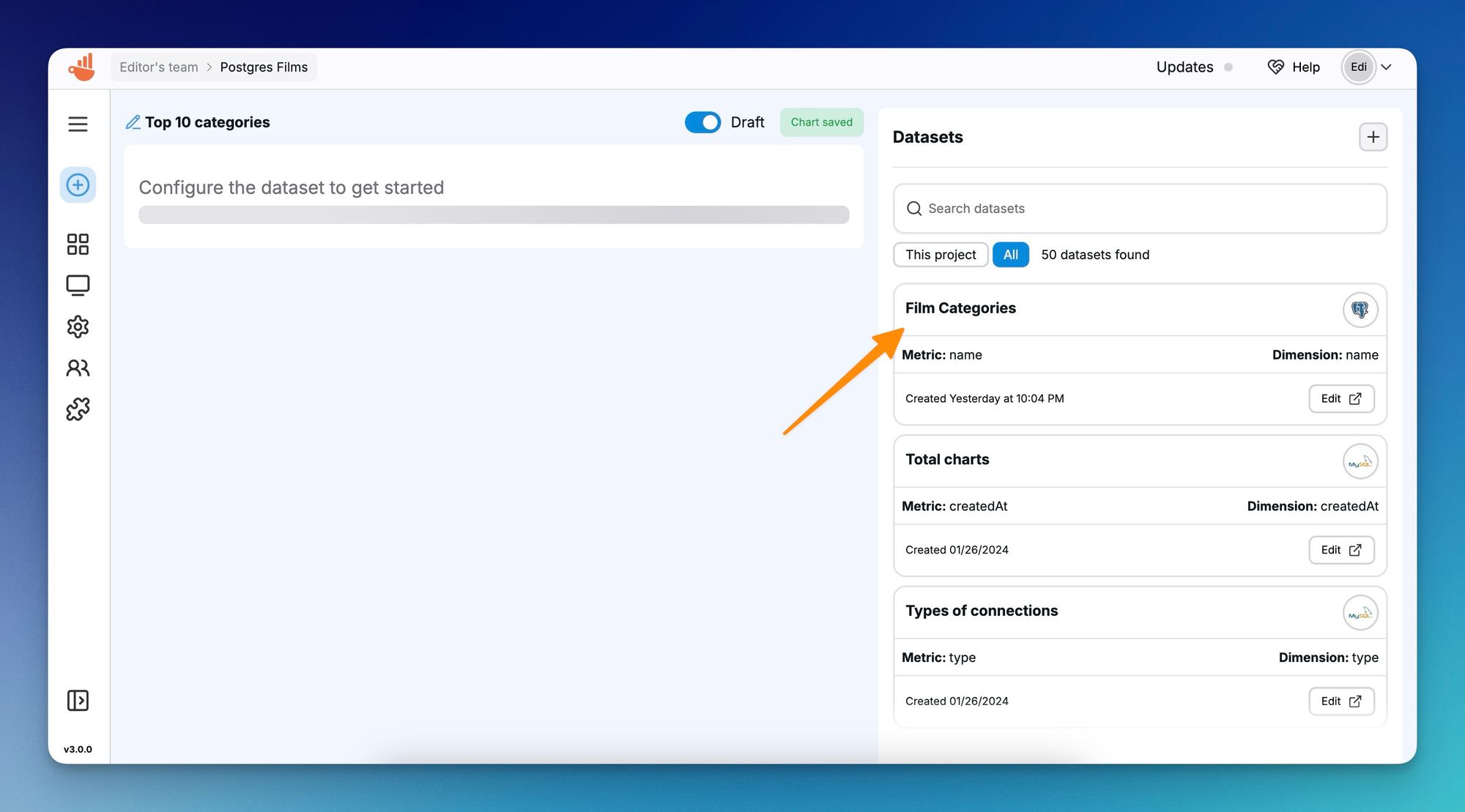 When creating a chart, you can select one or even multiple datasets to display on your chart. In our case, we are going to select the dataset we created earlier.