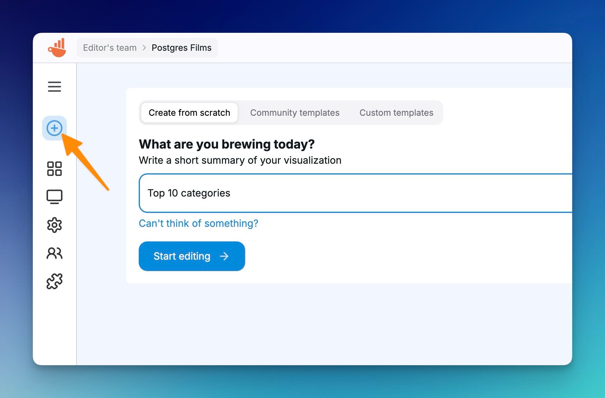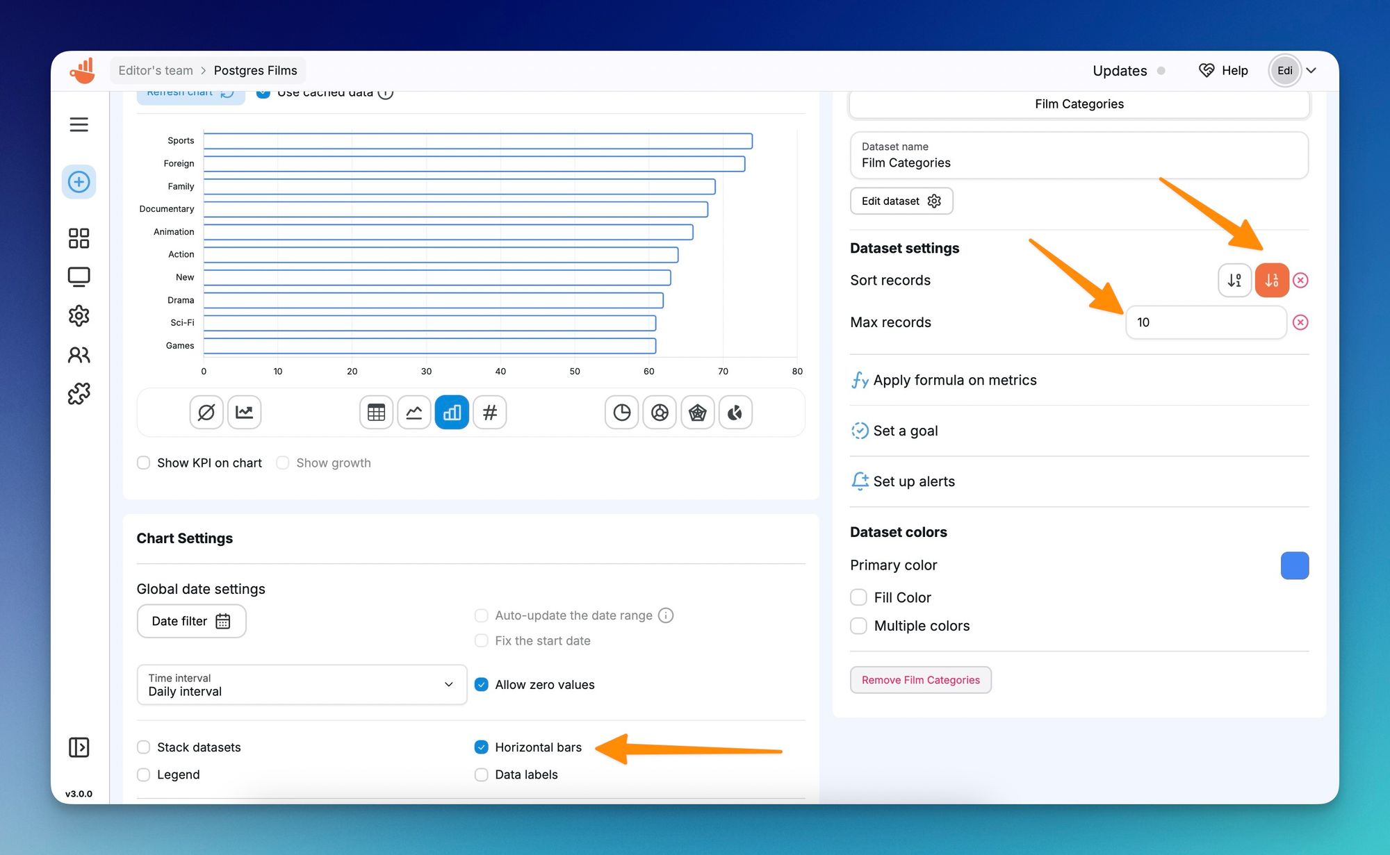 Next up, we are going to arrange the results to show the most popular first, cap the results at max 10, and then change the bar chart to be horizontal. We will end up with a clear visualization of the most popular film genres from the Postgres database.