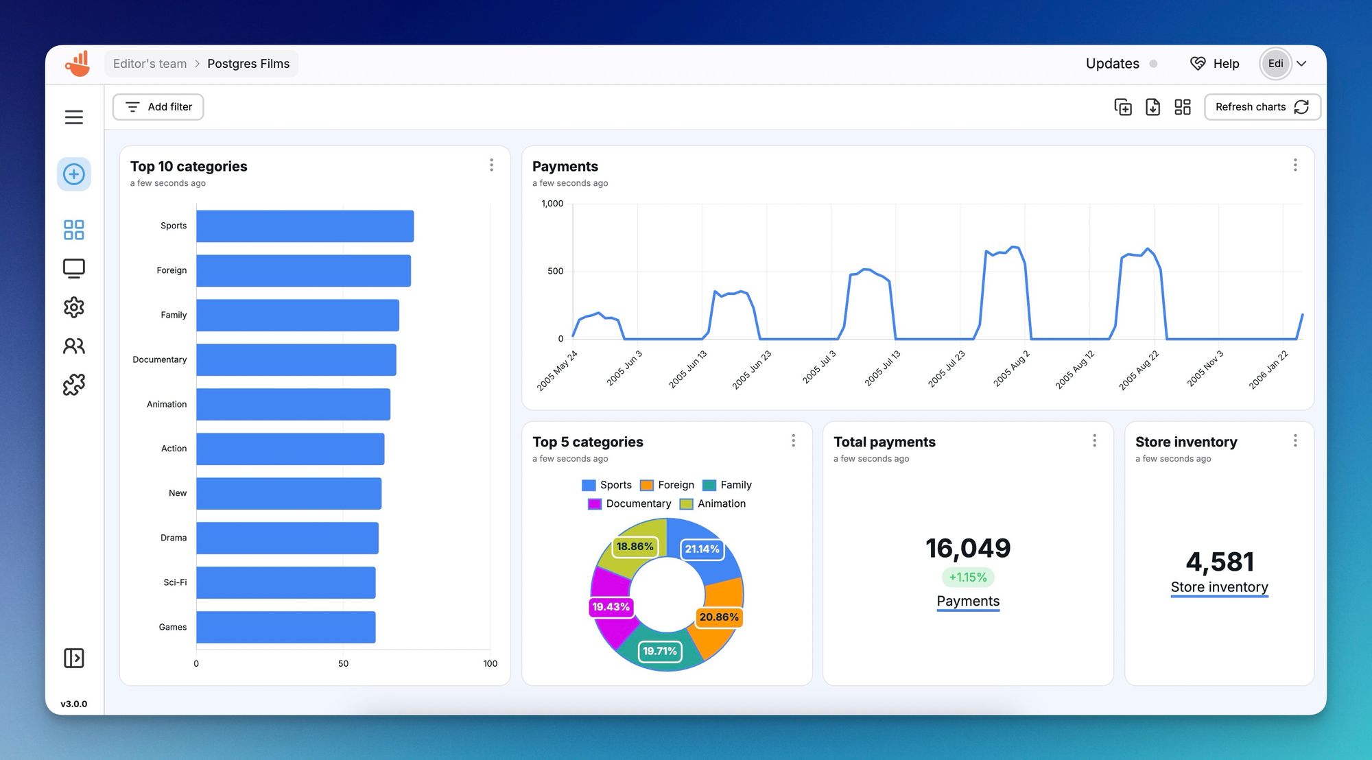 In this tutorial, we are going to connect Heroku Postgres to Chartbrew, fetch some data, and create charts to visualize our data. The data comes from a sample database called "Sakila" and you can find it here.