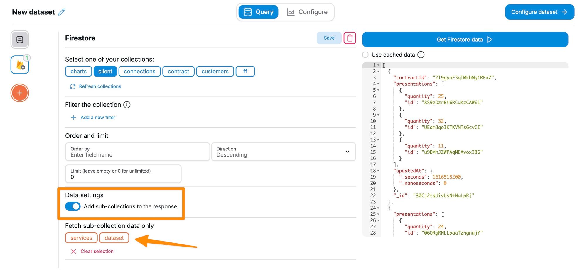 Chartbrew will automatically show existing sub-collections when you click on one of the main collections. Applying filters on the main collections will also filter out sub-collections.