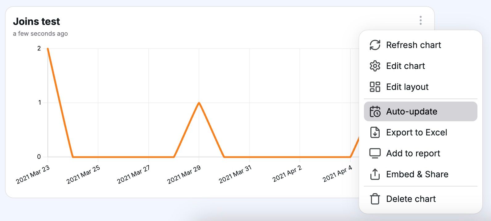 With Chartbrew, you can do many things with your charts. Other than arranging them into an insightful dashboard, you can set them so they auto-update in a time interval. The charts are not updating whenever a user refreshes the page. The data updates when triggered manually or when the auto-update interval is on.
