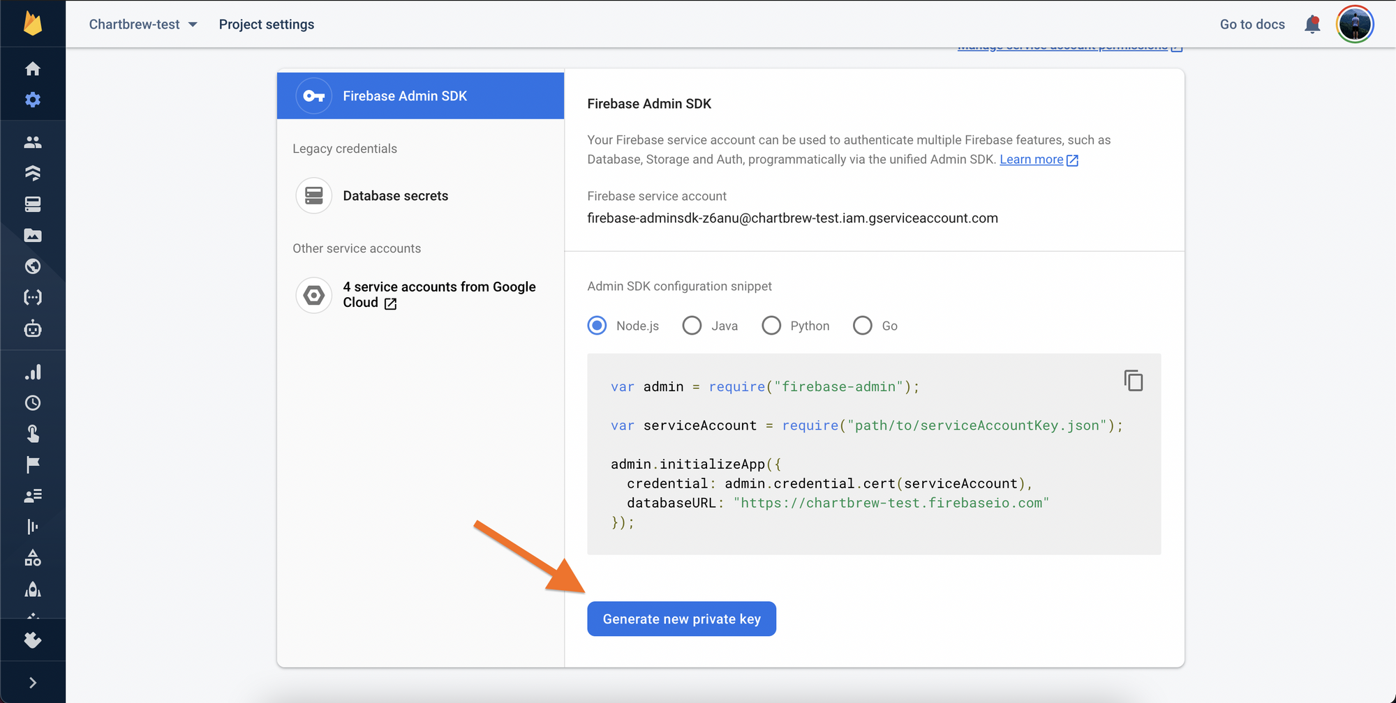 After you click on your project, you will get to the Firebase Admin page from where you have to download your JSON credentials file. Click on the "Generate a new private key" button and you will be prompted to download the key.