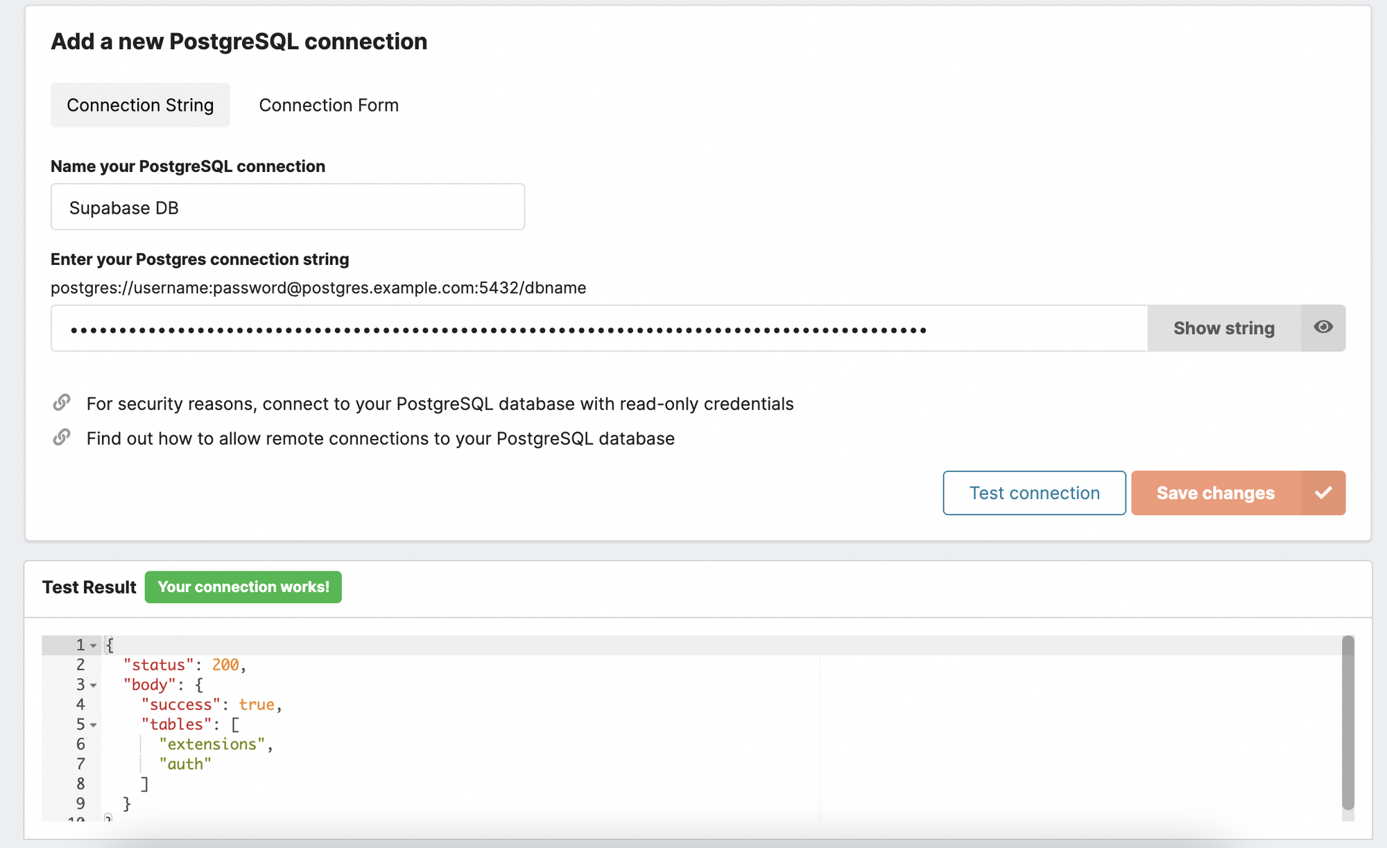 Successful connection to the PostgreSQL database from Supabase
