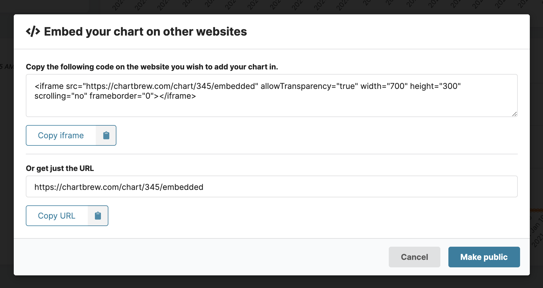 Now that the charts are going to keep being updated with live data, we can also share them in other spaces. From the same chart menu, select the Embed option to get the chart URL or the <iframe> code used for embedding on other sites.
