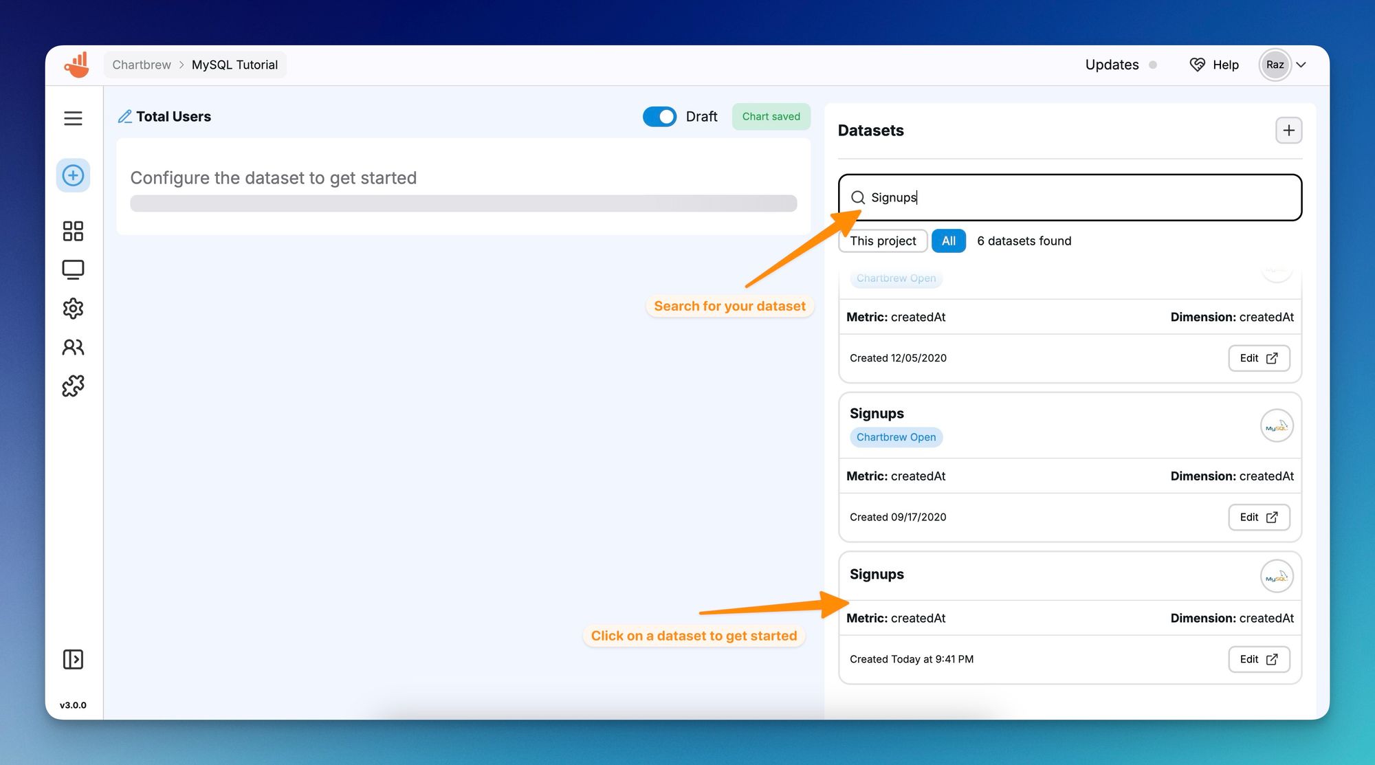 In the chart editor, select a dataset to get started. In this example, we are going to select the same dataset we created previously and aim to create a KPI widget to show the total number of users.