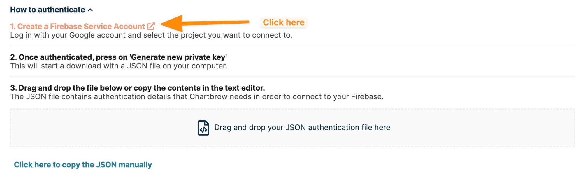 When you click on the link provided on the form, you will be redirected to Firebase. Select the project you want to authenticate to and follow the instructions below on how to download the credentials file.