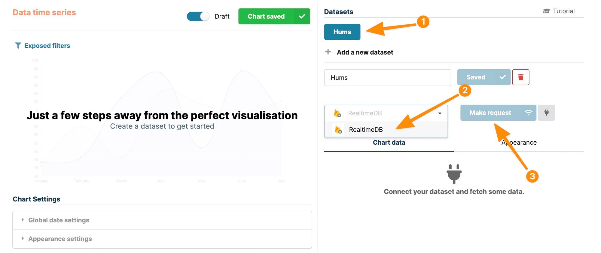 The first thing to do on the chart editor page is to create a new dataset and connect it to the Realtime Database integration we created earlier. Click on "Add a new dataset", type a name, and then select RealtimeDB from the connections list.